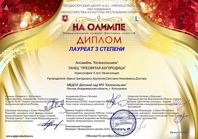 Новый учебный год для воспитанников МБДОУ «Детский сад N 5 «Колокольчик» начался с успеха. Хореографический ансамбль «Колокольчики»принял участие в Международном конкурсе-фестивале «На Олимпе», где занял призовое 3 место. Поздравляем! Молодцы! Мы гордимся вами, дорогие наши «Колокольчики». Удачи вам и новых побед!